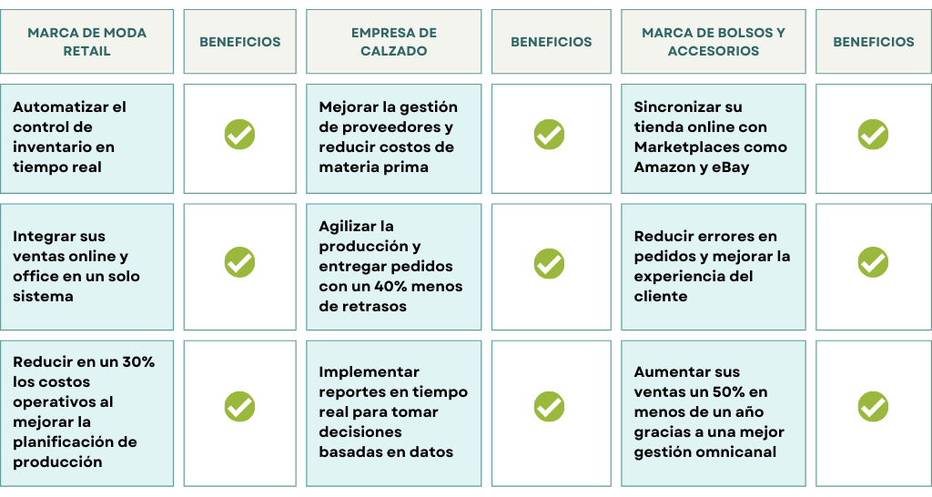 La implementación de una plataforma digital especializada en moda no es solo una tendencia, sino una necesidad para las empresas que buscan eficiencia y crecimiento. A continuación, te compartimos algunos beneficios que han sufrido estos sectores gracias a una buena implementación de un ERP Moda logrando optimizar su gestión con este tipo de software: